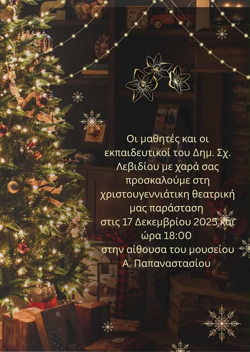 Οι μαθητές και οι εκπαιδευτικοί του Δημ. Σχολείου Λεβιδίου με χαρά σας προσκαλούμε στη χριστουγεννιάτικη θεατρική μας παράσταση στις 17 Δεκεμβρίου 2025 και ώρα 18:00 στην αίθουσα του μουσείου Α.Παπαναστασίου.