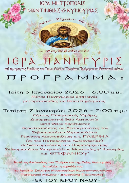 Με κάθε λαμπρότητα εορτάζει ο Ιερός Ναός Τιμίου Προδρόμου Λεβιδίου την 7 Ιανουαρίου σύμφωνα με το ακόλουθο πρόγραμμα.