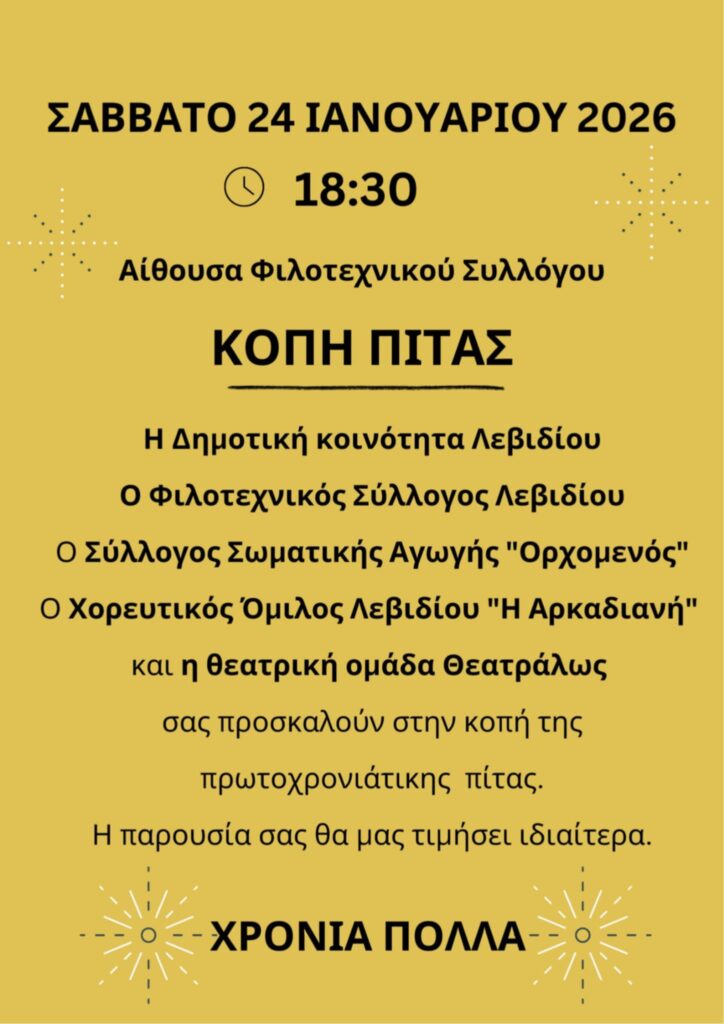 Η Ιερά Μητρόπολη Μαντεινείας και Κυνουρίας, οι ενοριακοί Ναοί, η τοπική Κοινότητα Λεβιδίου,  οι Σύλλογοι και Φορείς του Λεβιδίου σας προσκαλούν στην Τελετή Καθαγιασμού των υδάτων στο Πάρκο “Κάτω Βρύσης” τη  Τρίτη 6 Ιανουαρίου 2026 και ώρα 11:00 π.μ. μετά το πέρας της Θείας Λειτουργίας των Θεοφανείων.